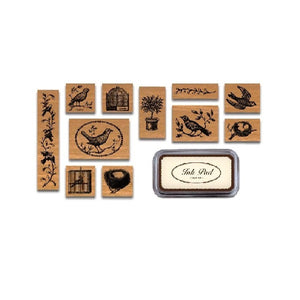 Cavallini & Co's bird's & nests rubber stamp set comprises of 11 different rubber stamps. It includes a black ink pad.