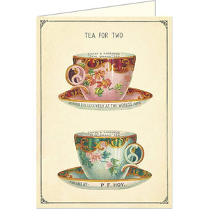 The Cavallini & Co. Tea For Two single greeting card has two fancy tea cups displayed on the front of the card. The internal of the card is blank, ready for users to personalize a message. The cards are printed on Cavallini's signature Italian Paper.