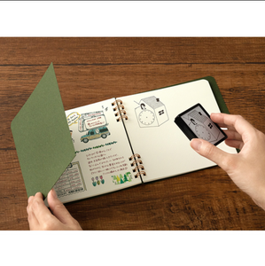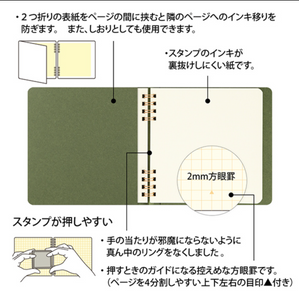 This notebook uses thick paper for the text, which makes it difficult for the stamp ink to strike through. The cover has a two-fold structure, and if you sandwich the folded part between pages, it will prevent ink from transferring to the next page, and it can also be used as a bookmark.
