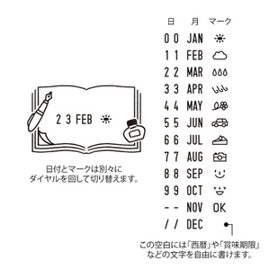 A simple and easy-to-use design with a convenient "stationery pattern" that allows you to write letters with an illustration of a fountain pen and ink. Since it is designed to write letters on the top and bottom of the pattern, you can add a little message or title The date and mark part can be switched by turning the dial. *Since the outer pattern is fixed, it does not switch.