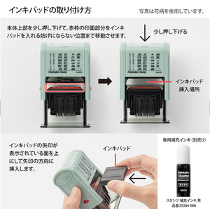 〇 Please set the attached ink pad in the correct position of the main unit. Be careful when handling the ink pad. If you do not use the stamp for a long time, be sure to remove the ink pad from the main body and store it with the lid on. 〇 Please use it after trying it several times. The ink adheres to the entire stamp surface and can be pressed cleanly. 〇 Please press on a flat surface. 〇Because it uses oil-based ink, please be careful not to get it on your clothes. 〇 Depending on the material of the paper to be stamped, the ink may take longer to dry, and bleeding or strike-through may occur. 〇Do not rub the stamp surface rubber with your fingers or sharp objects as it may cause damage. 〇 Do not place near fire or in places with high temperatures (such as inside a car in the summer or in direct sunlight). 〇 You can press about 2,000 times with the included ink pad. If the ink becomes thin , please use the separately sold replacement ink