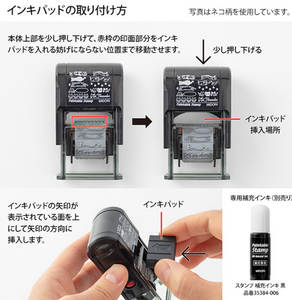 〇Because the ink is full up to the capacity at the beginning, it is easy to get a lot of ink when pressed on paper. This may cause the paper to strike through. Also, if you press it too hard or press it for a long time, a lot of ink will come out, which may cause strikethrough. Be sure to try it out before use. * If you do not use the stamp for a long time, remove the ink pad from the main body, cover the ink pad, and store it. 〇Because the oil-based ink is used, be careful not to get it on clothing. 〇 Depending on the material of the paper to be imprinted, the ink may dry slowly or bleed may occur. * Do not rub the rubber stamp surface with your fingers or sharp objects as it may cause damage. * Do not place near fire or places with high temperature (in a car in summer or in direct sunlight). 〇 You can press the attached ink pad about 2,000 times. If the ink becomes thin , please use the "exclusive replenishment ink black">> sold separately .