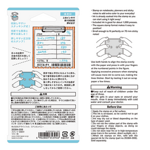 〇 At the beginning of use, the ink is full to the capacity, so it is easy for a lot of ink to come out when pressed on paper. Therefore, paper strike through may occur. Also, if you press it strongly or for a long time, a lot of ink will come out and it may cause strike-through. Be sure to press it before use. 〇 Please push it on a flat surface. 〇Because oil-based ink is used, please be careful not to adhere it to clothing. 〇 Depending on the material of the paper to be stamped, the ink may dry slowly or bleeding may occur. 〇 Do not rub the rubber part of the stamp surface strongly with your finger or a sharp object as it may cause damage. 〇 Do not place near fire or in places with high temperatures (inside a car in summer or in direct sunlight). 〇 It is a size that can be pressed perfectly on 70 mm square sticky notes. 〇 You can press it about 1,000 times with this ink.