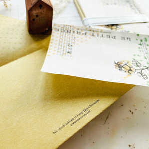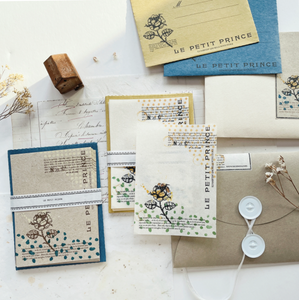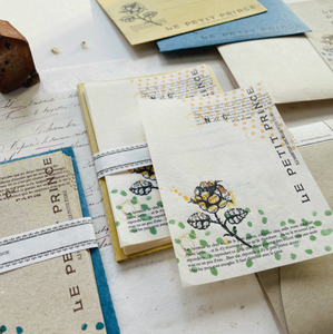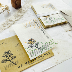 This letterset is inspired by the French novella "Le Petit Prince".  Each pack includes 20 sheets natural textured writing paper and 5 unique colored envelopes.  Button-tie packaging envelope.