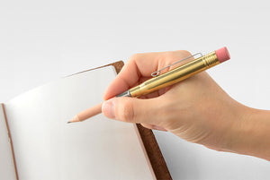 Easily converted into a compact “carry around” size and elongated for easy writing, Brass Pencil also boasts a depth in texture that solid brass acquires over time and use, complemented with a high-quality finish created by skilled Japanese craftsmen. The top of the pencil has a ring for attaching a hook or string, so you can clip it to your bag as a key holder or customize it using beads and other items – let your imagination run free! The ring can also be removed for a clip-free pen if you prefer. You can put it on TRAVELER’S notebook Pen Holder or just put in your pocket.