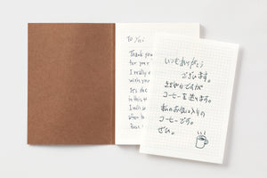 Letter Pad in the same size as TRAVELER’S notebook uses MD PAPER Cotton containing soft-textured cotton pulp to achieve the best possible comfort when writing. Pop it in your notebook or place it in our Kraft Folder so you can write a letter whenever the mood takes you, whether you’re on vacation or just sitting in a café or park in your neighborhood.